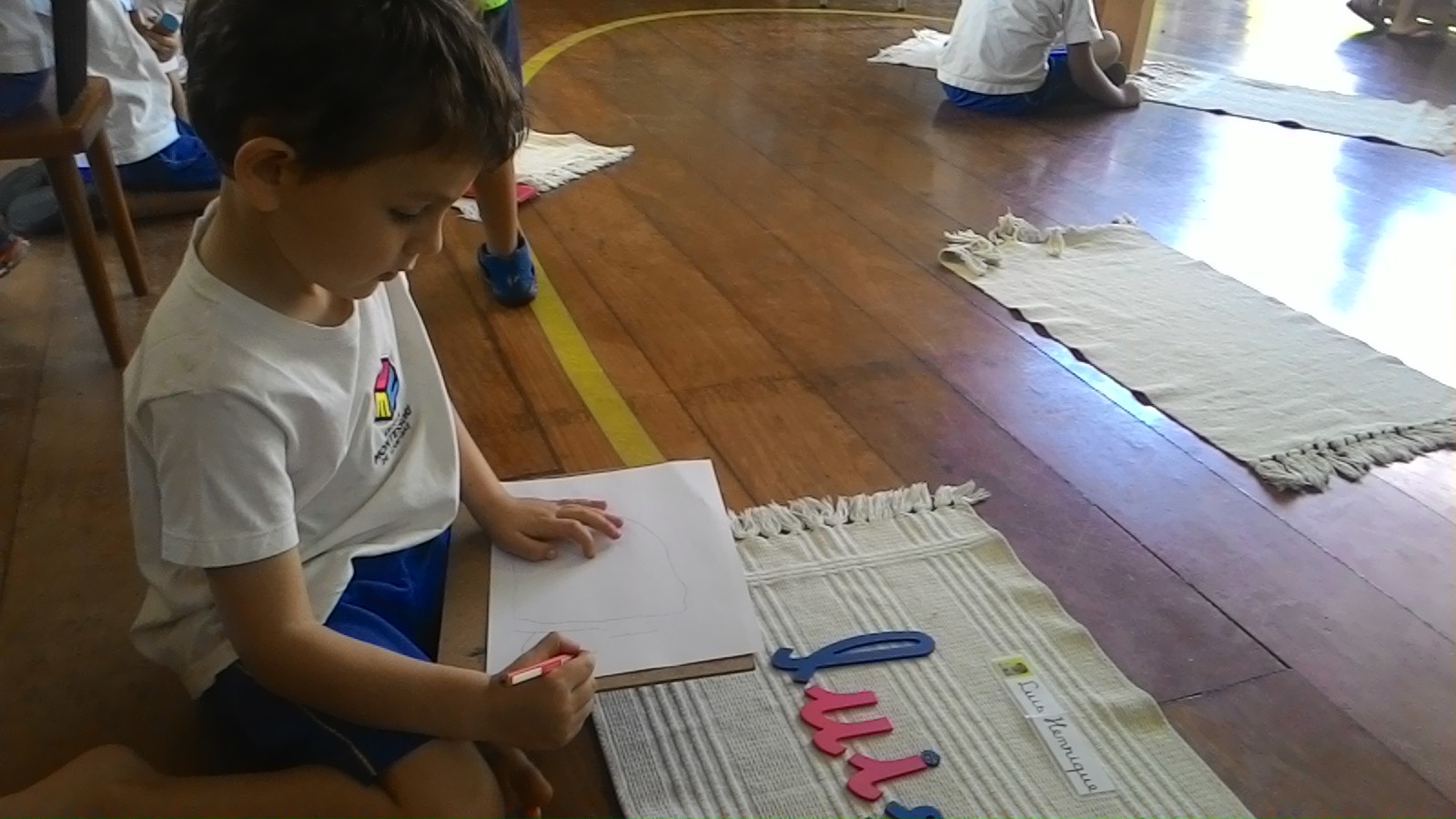 Nesta sala, as crianças são inicialmente apresentadas às letras de lixa onde passam a reconhecer os sons de cada letra, ou seja, aprendem cada letra foneticamente. Quando já reconhecem o som de algumas letras passam a utilizar o  Alfabeto Móvel para a construção de palavras.