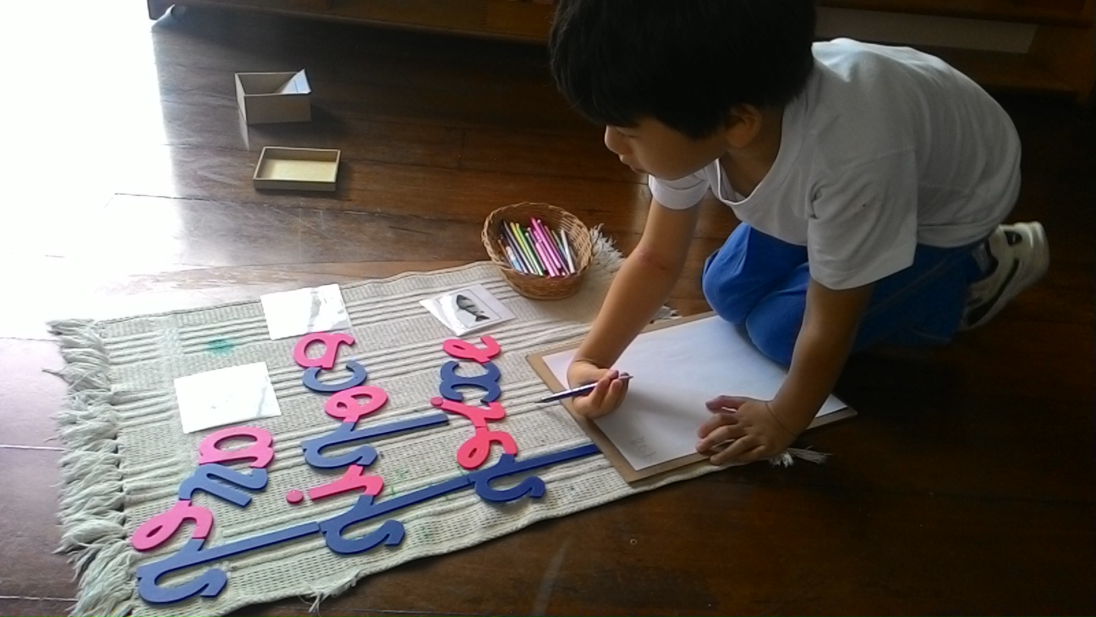 A caixa com as letras do Alfabeto Móvel permanece num espaço específico da sala e a criança escolhe o local em que irá colocar seu tapete para escrever as palavras escolhidas. Desta forma, para escrever as palavras, a criança precisa movimentar-se pelo ambiente buscando cada uma das letras que compõem a mesma.