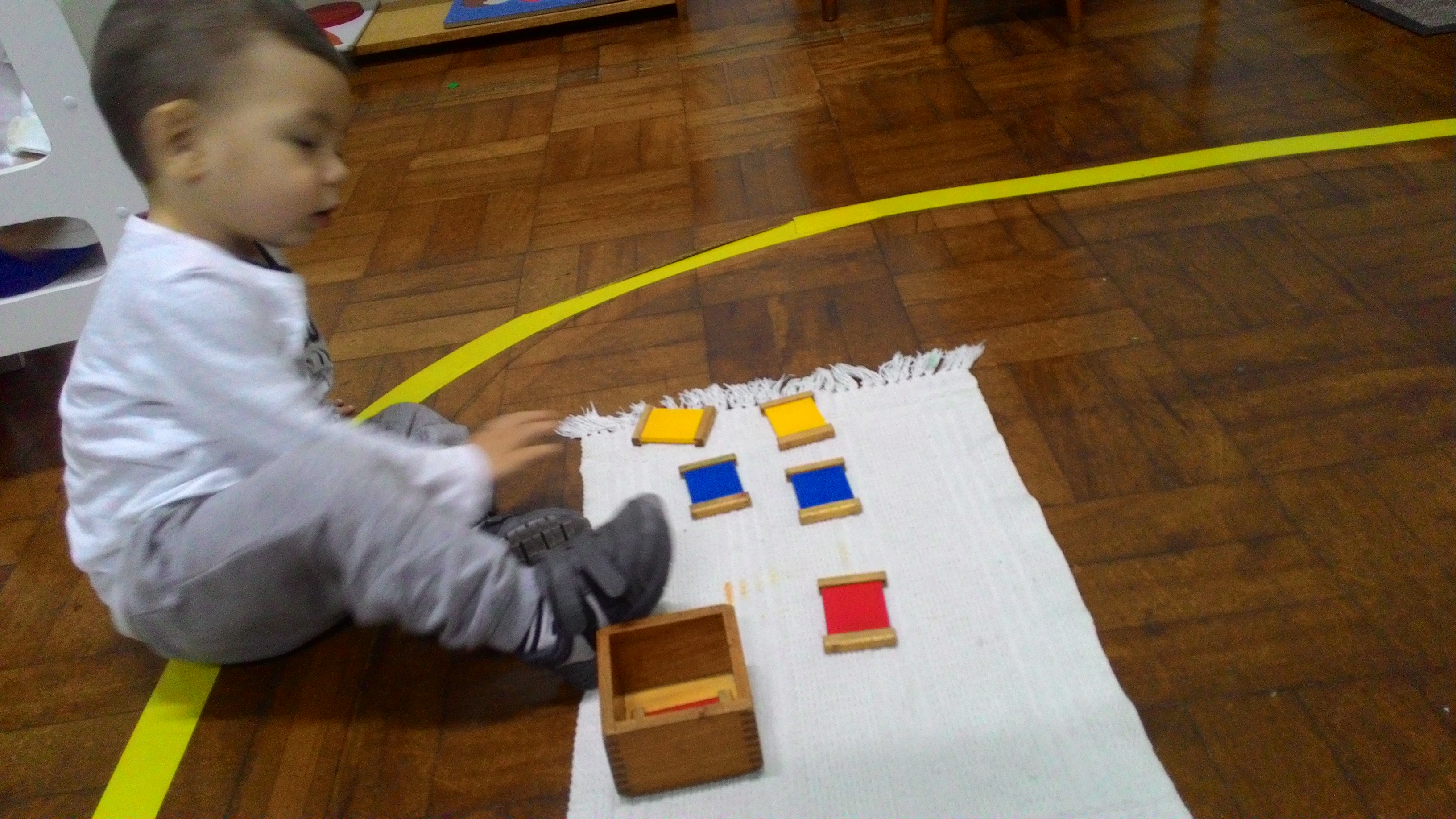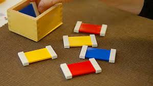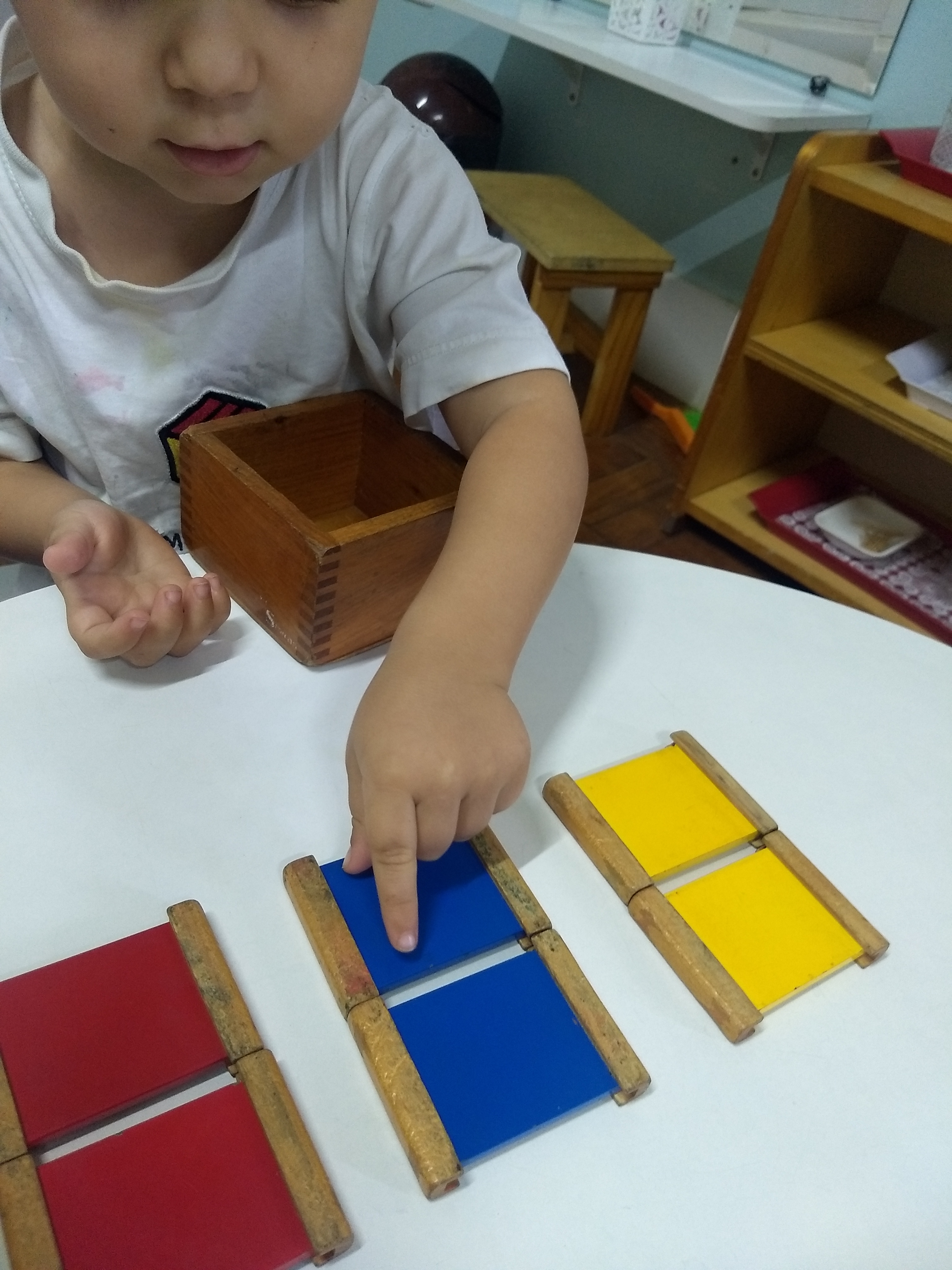 A Primeira Caixa de Cores é da área de Sensorial da sala Montessori. É uma caixa com seis tabletes, um par de cada cor primária (vermelho, azul e amarelo). Nesta atividade a educadora irá trabalhar inicialmente o pareamento dos tabletes e assim que a criança conseguir colocar os pares juntos é introduzida a nomenclatura das cores.