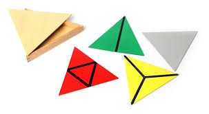 Uma destas caixas é no formato triangular e possui dentro dela um triângulo cinza, dois triângulos verdes, três triângulos amarelos e quatro triângulos vermelhos onde os triângulos unidos pelas cores formam um maior do tamanho da caixa.