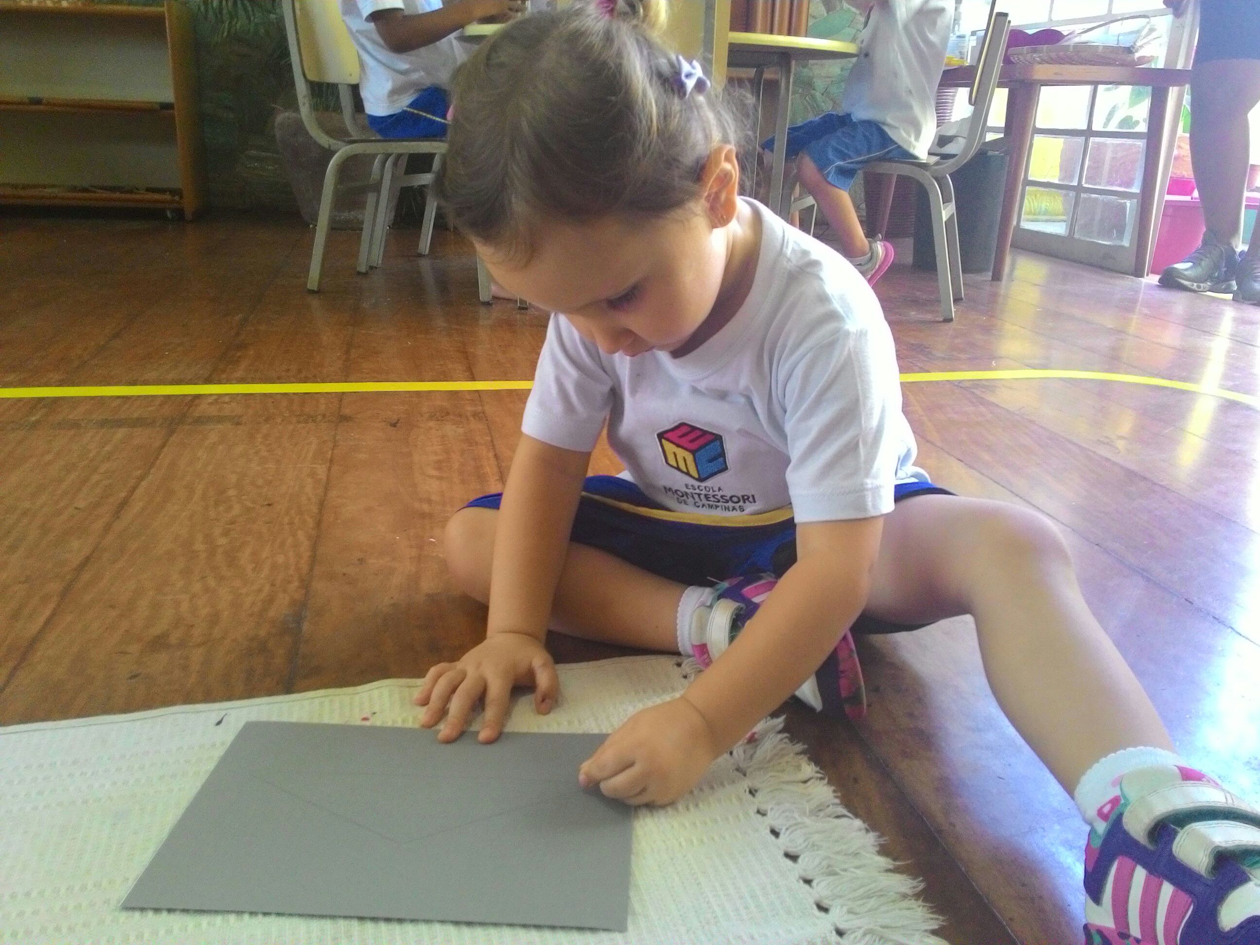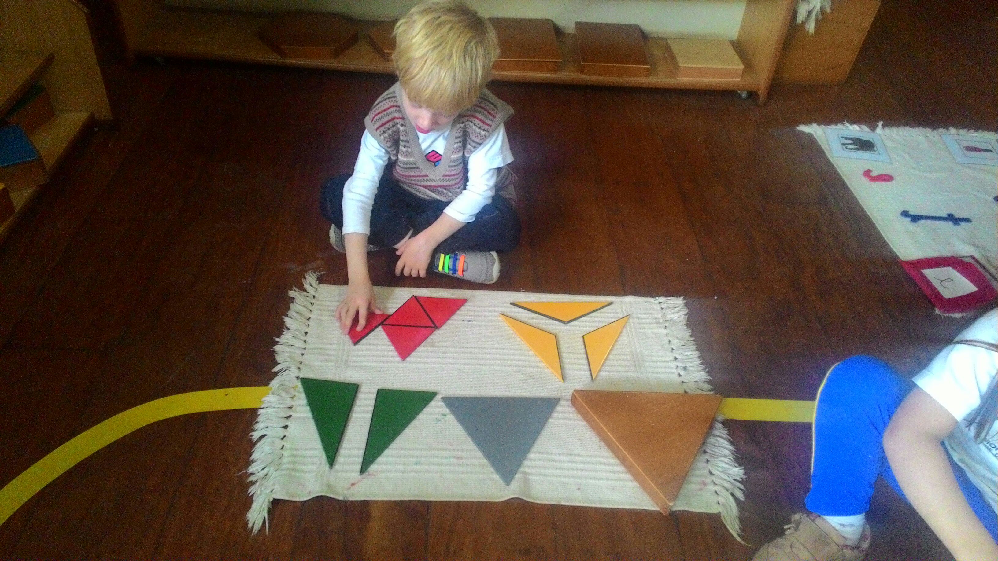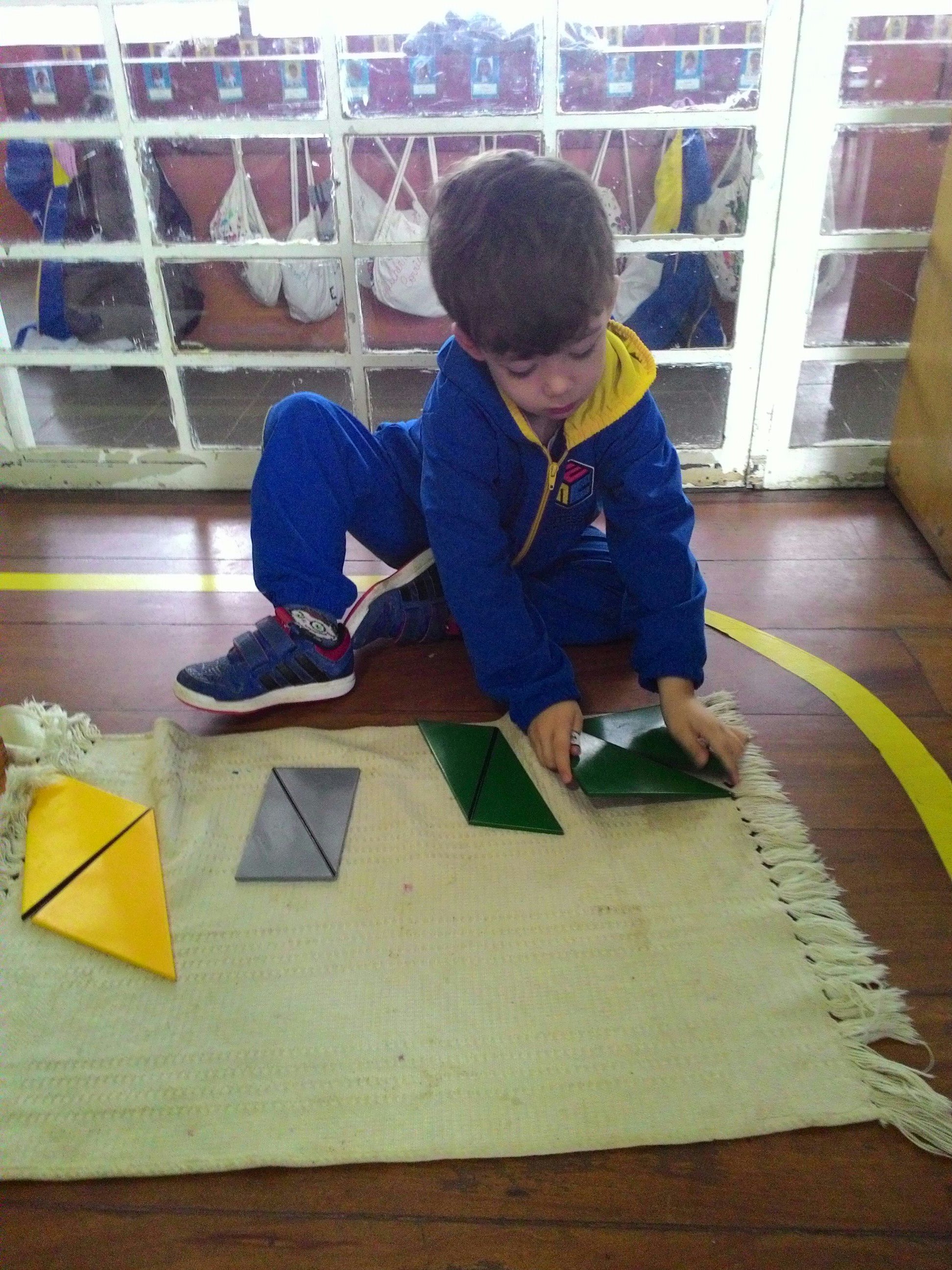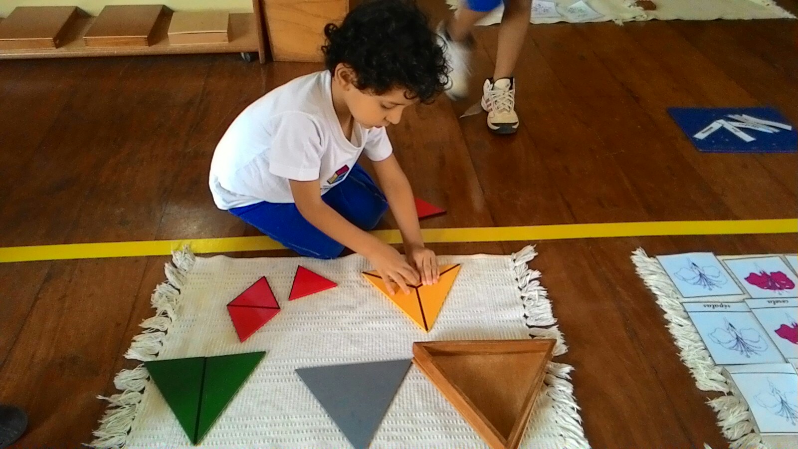 Os triângulos construtores estão em caixas na área Sensorial da sala Montessori.