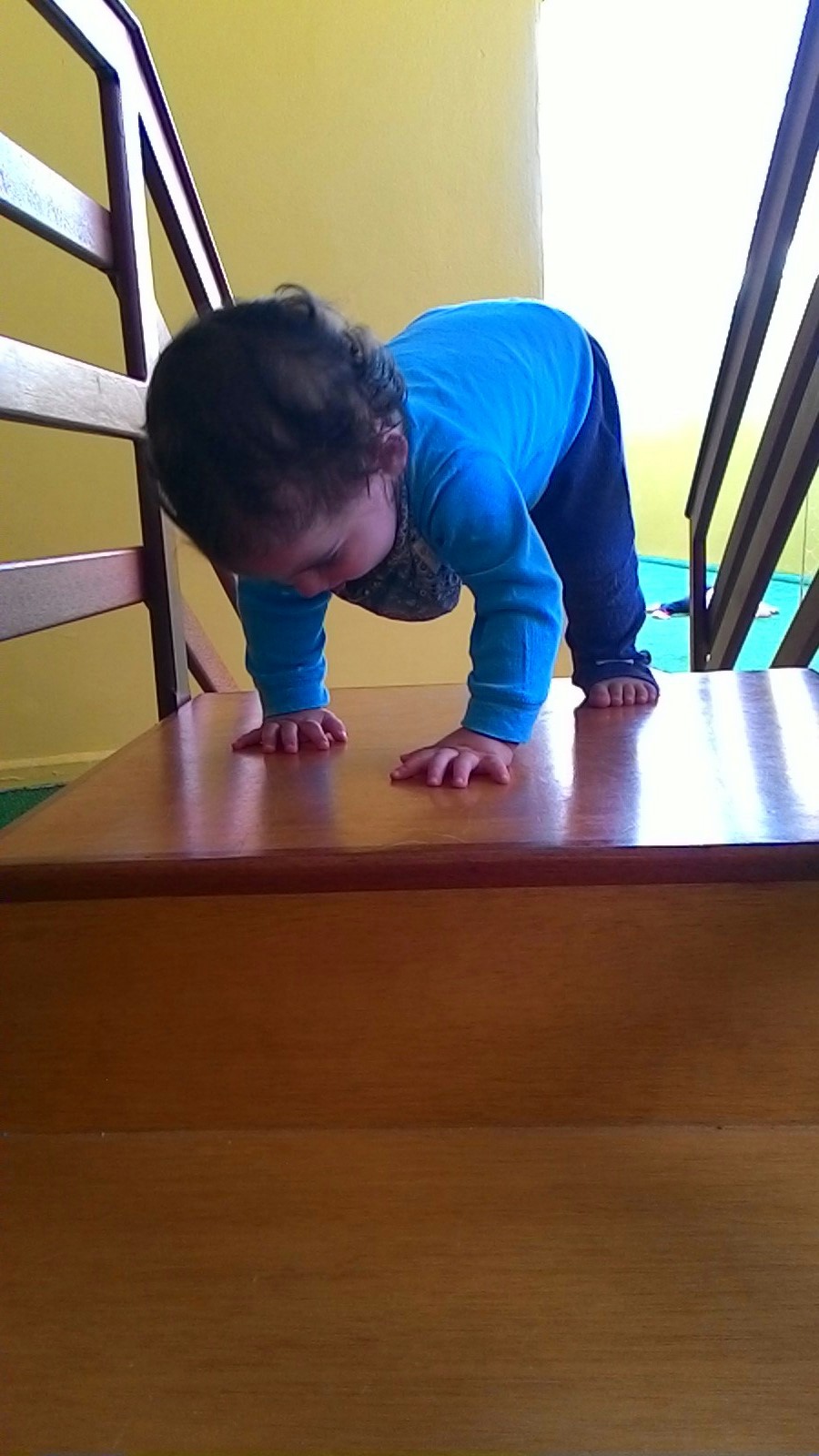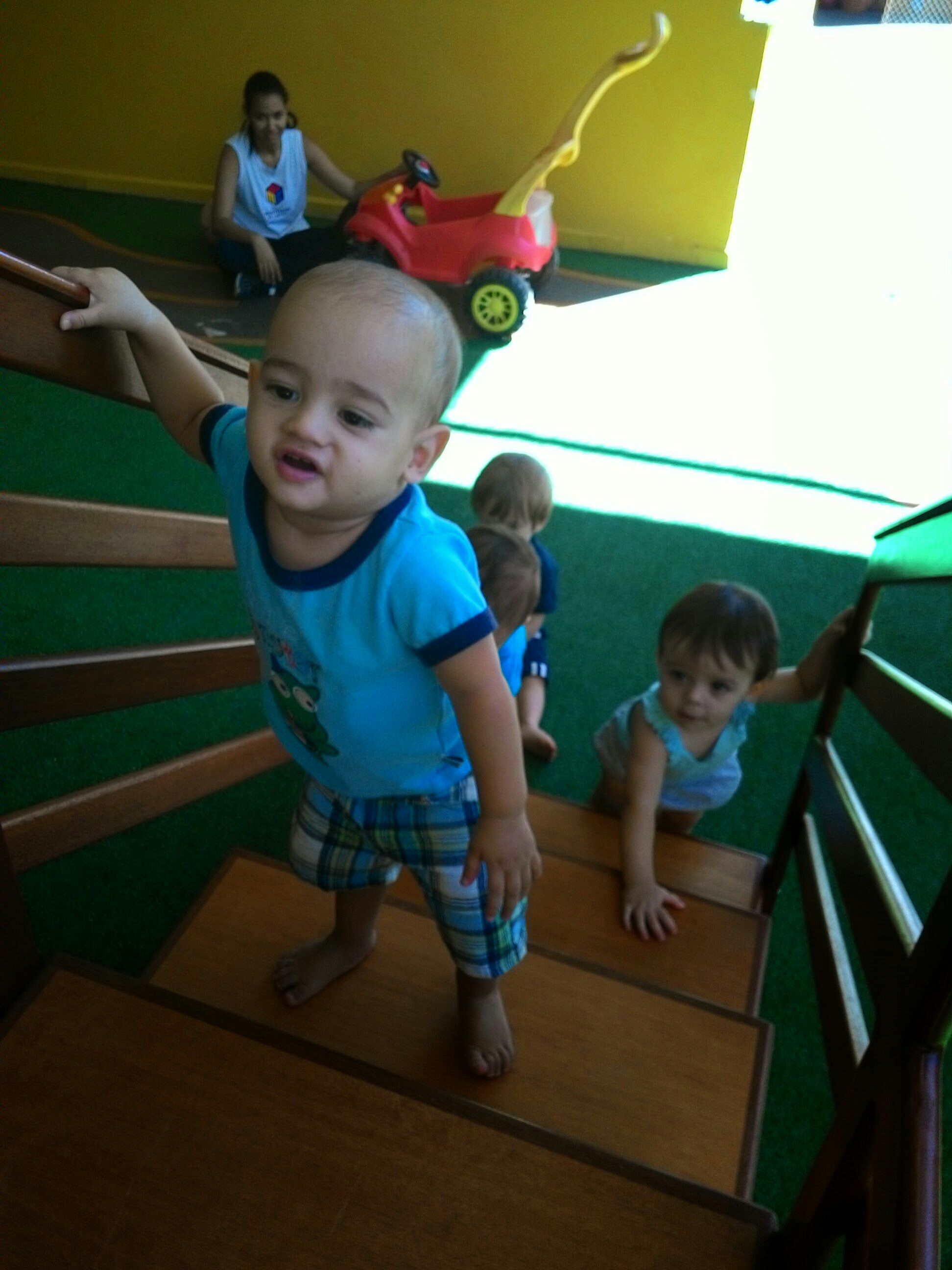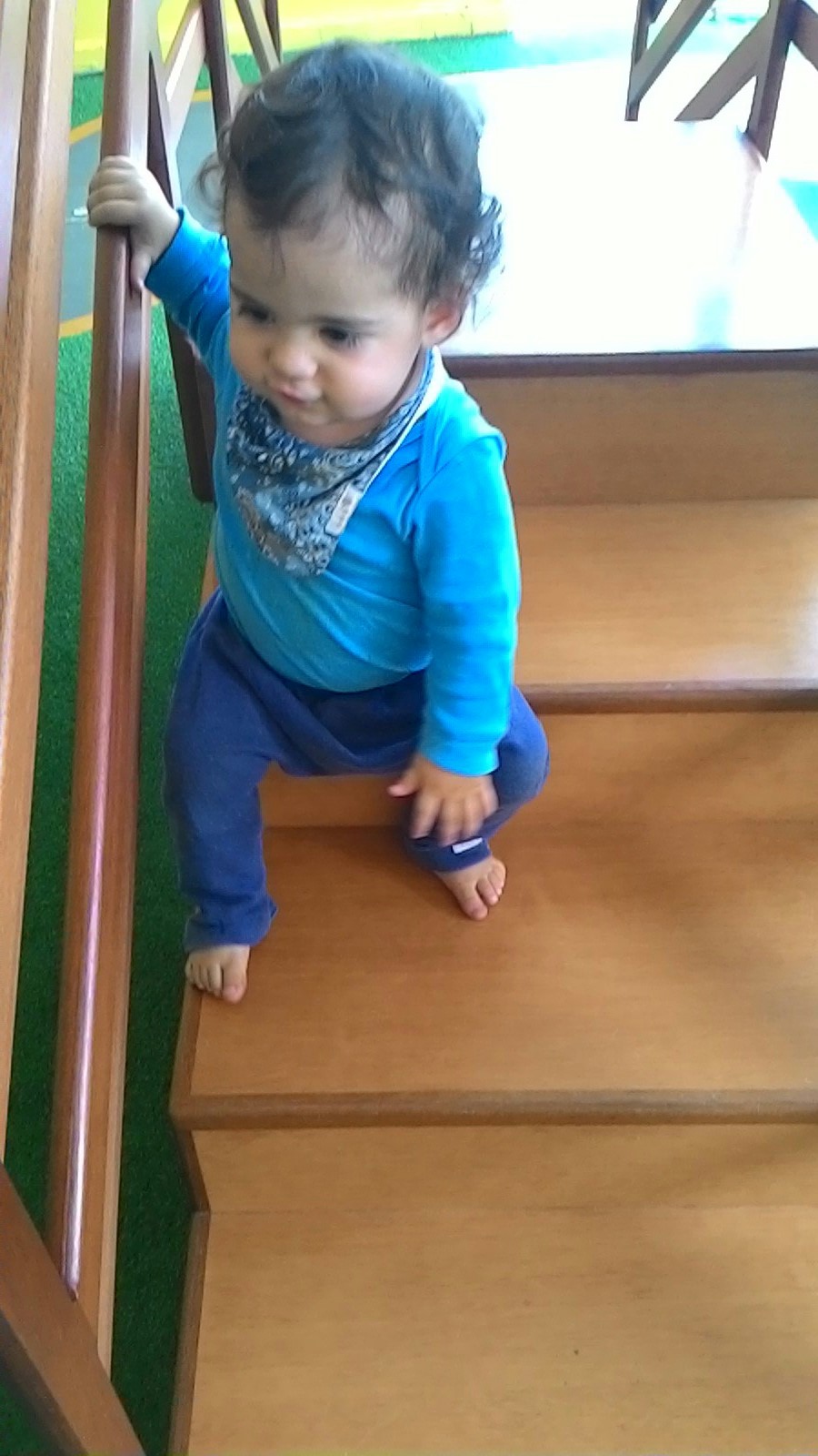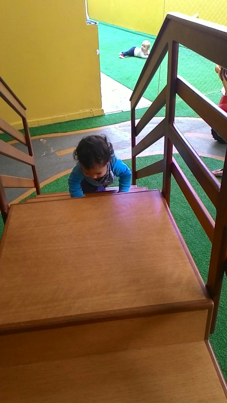 Subir e descer escada é uma das atividades encontradas num ambiente Montessori com crianças de 0 a 3 anos. Nesta faixa etária as crianças possuem grande interesse em adquirir a habilidade de realizar esta tarefa e repetem o exercício várias vezes até atingir seu objetivo.